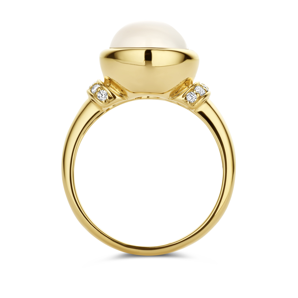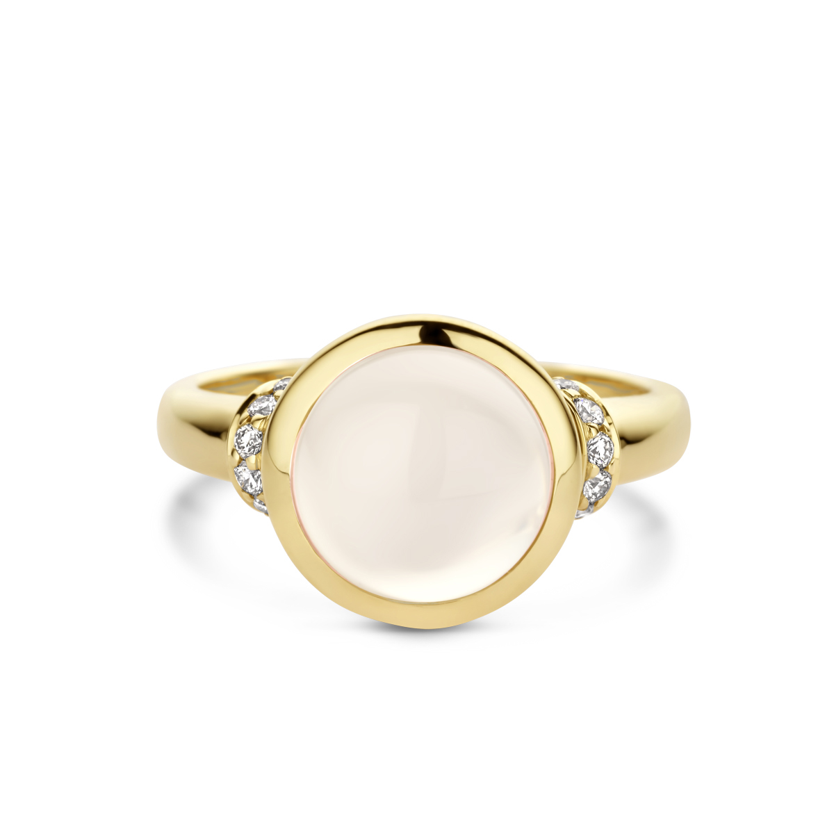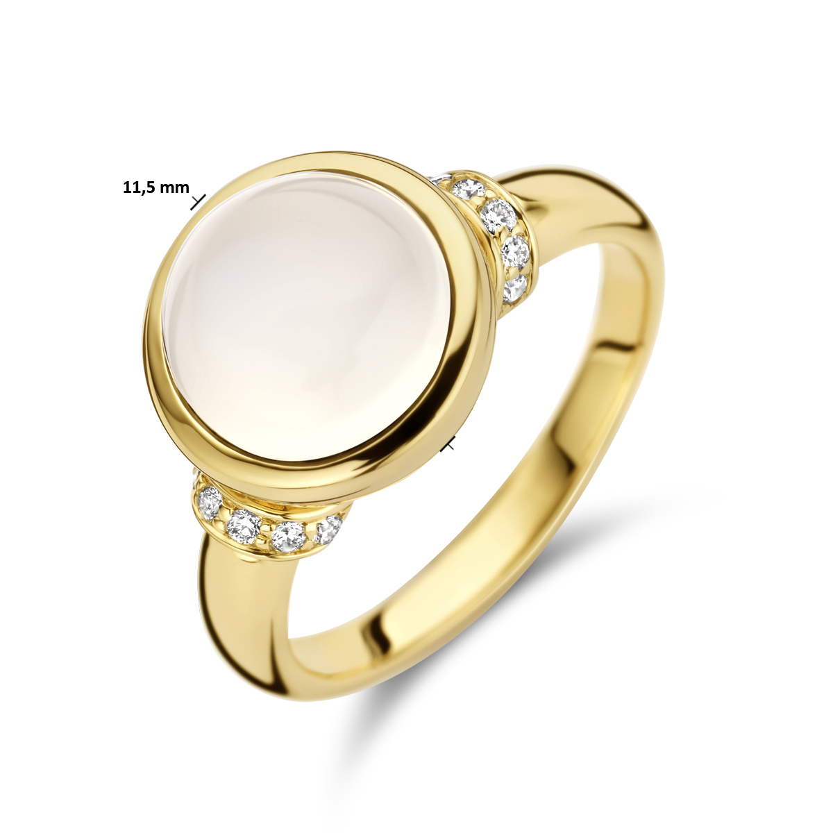 14k Geelgouden ring uitgevoerd met een schitterende diamant rij en een witte maansteen. De ring heeft een breedte van 11.5mm.