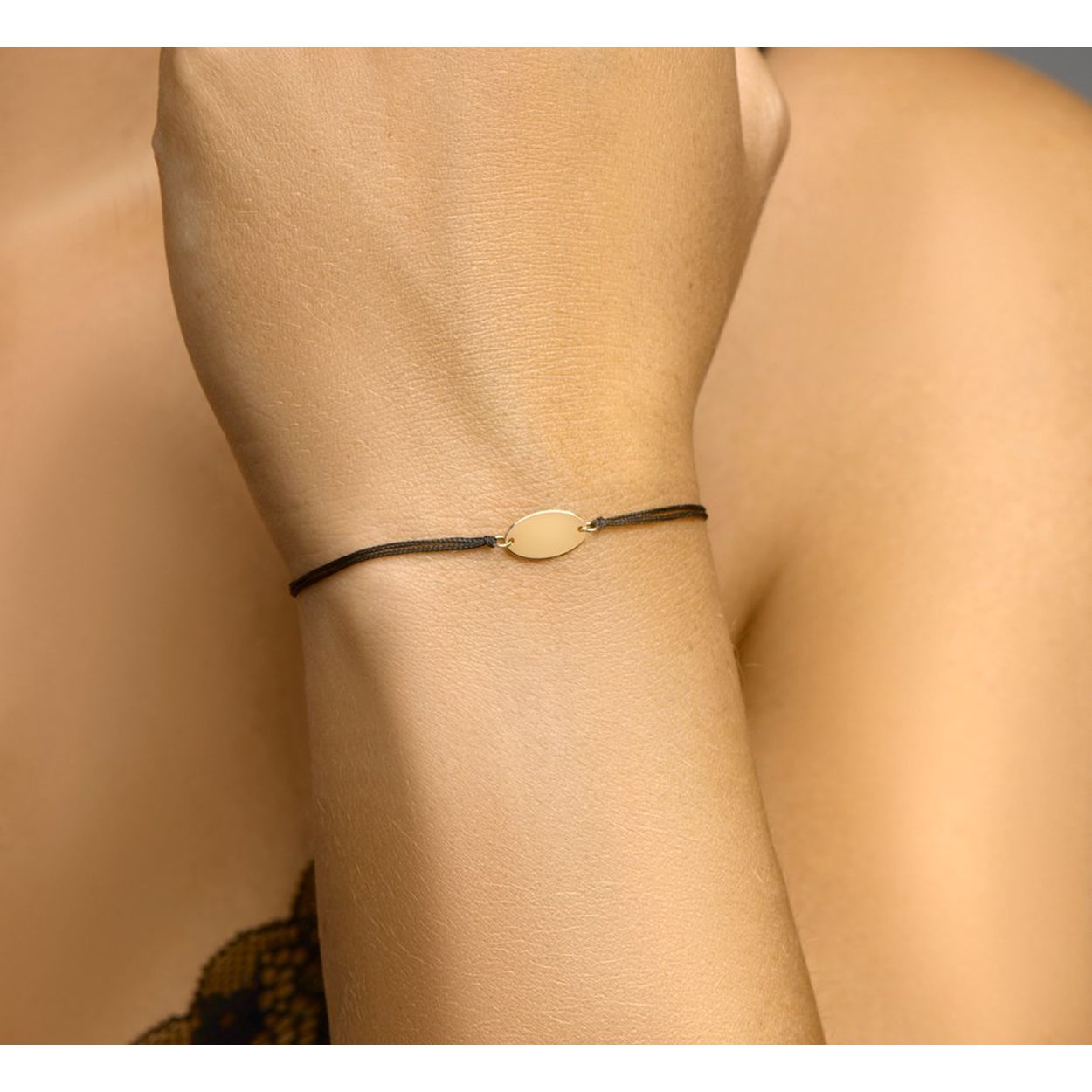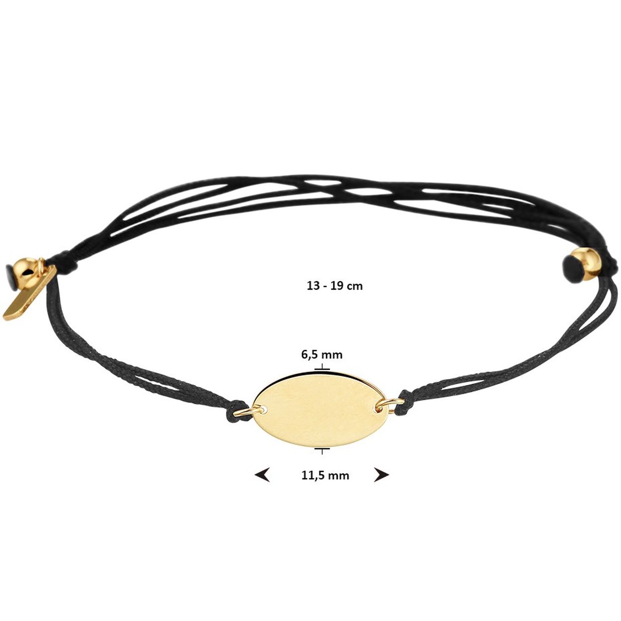 Zwart gevlochten armband met 14k geelgouden elementen. De armband is verstelbaar van 13 tot 19cm. Het plaatje heeft een afmeting van 6.5x11.5mm.