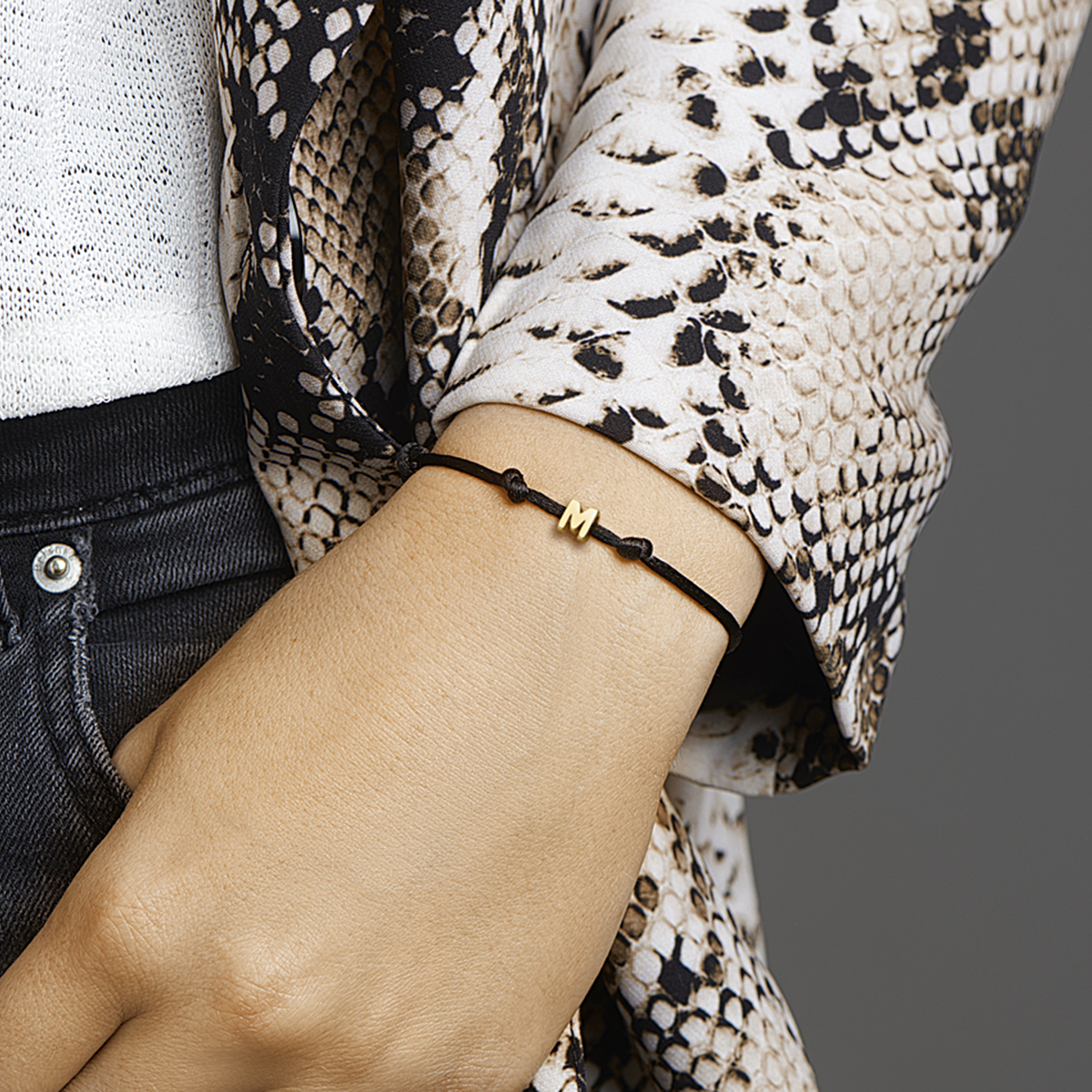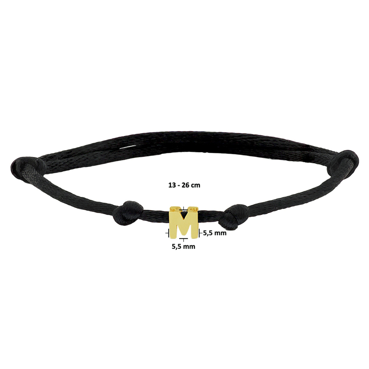 Zwart gevlochten armband uitgevoerd met een 14k geelgouden letter M. De armband heeft draaglengtes van 13 tot 26cm. De letter heeft een afmeting van 5.5x5.5mm.