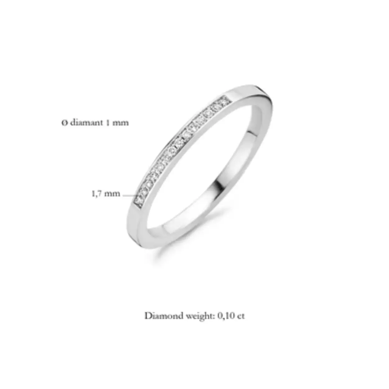 Deze ring van 14k witgoud glinstert door de perfect aansluitende, briljant geslepen diamanten. De band heeft een doorsnee van 1,7 mm en de diamanten hebben een (totaal) karaatgewicht van 0,06. Ook prachtig te combineren met andere ringen uit onze collectie.