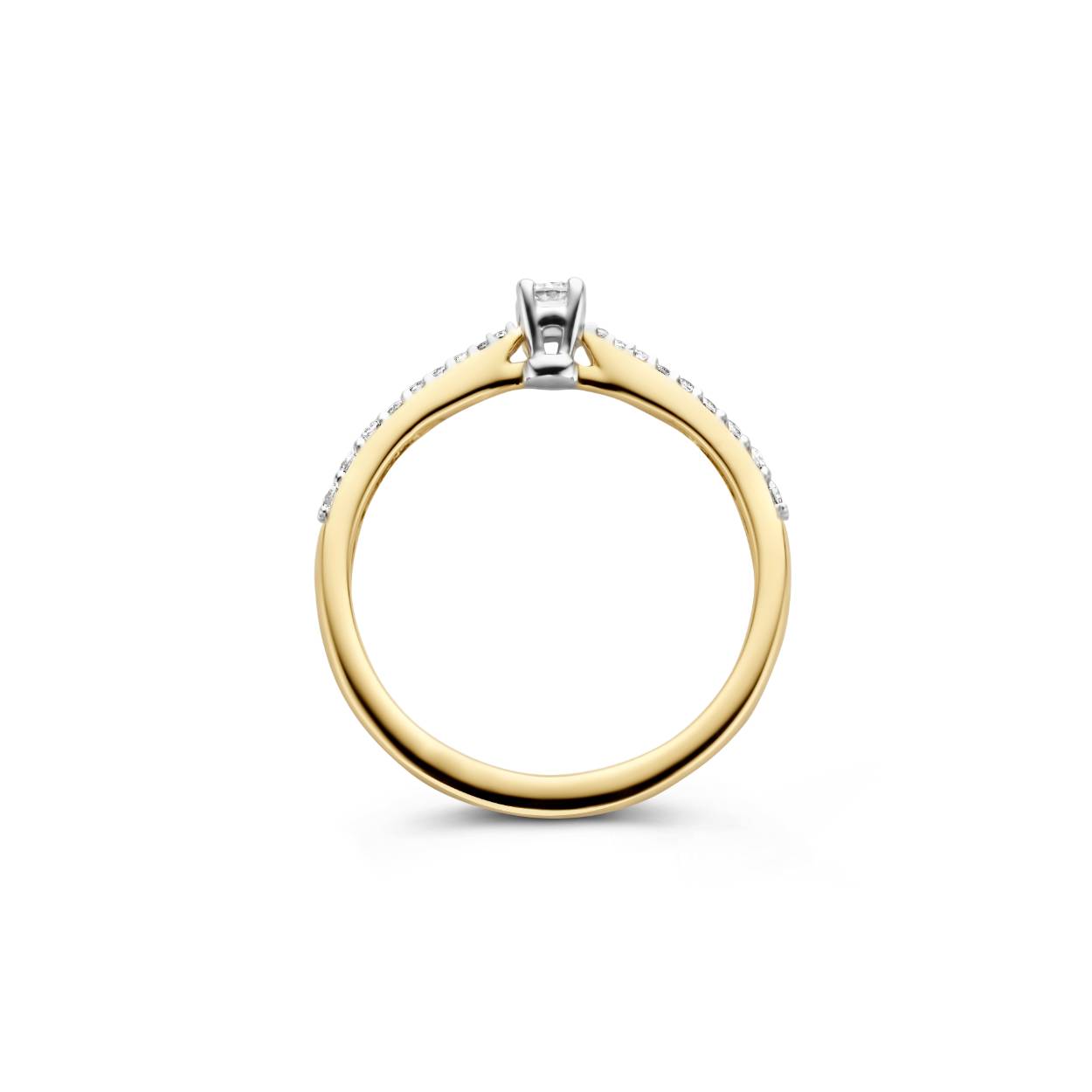 geelgouden solitairring met diamant in scheen.