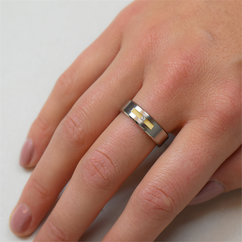 Deze gematteerde ring van Boccia Titanium heeft een goudkleurig accent en een met de hand gezette diamant. De diamant in dit sieraad zorgt voor een sprankelend effect. De ring is 6mm breed.