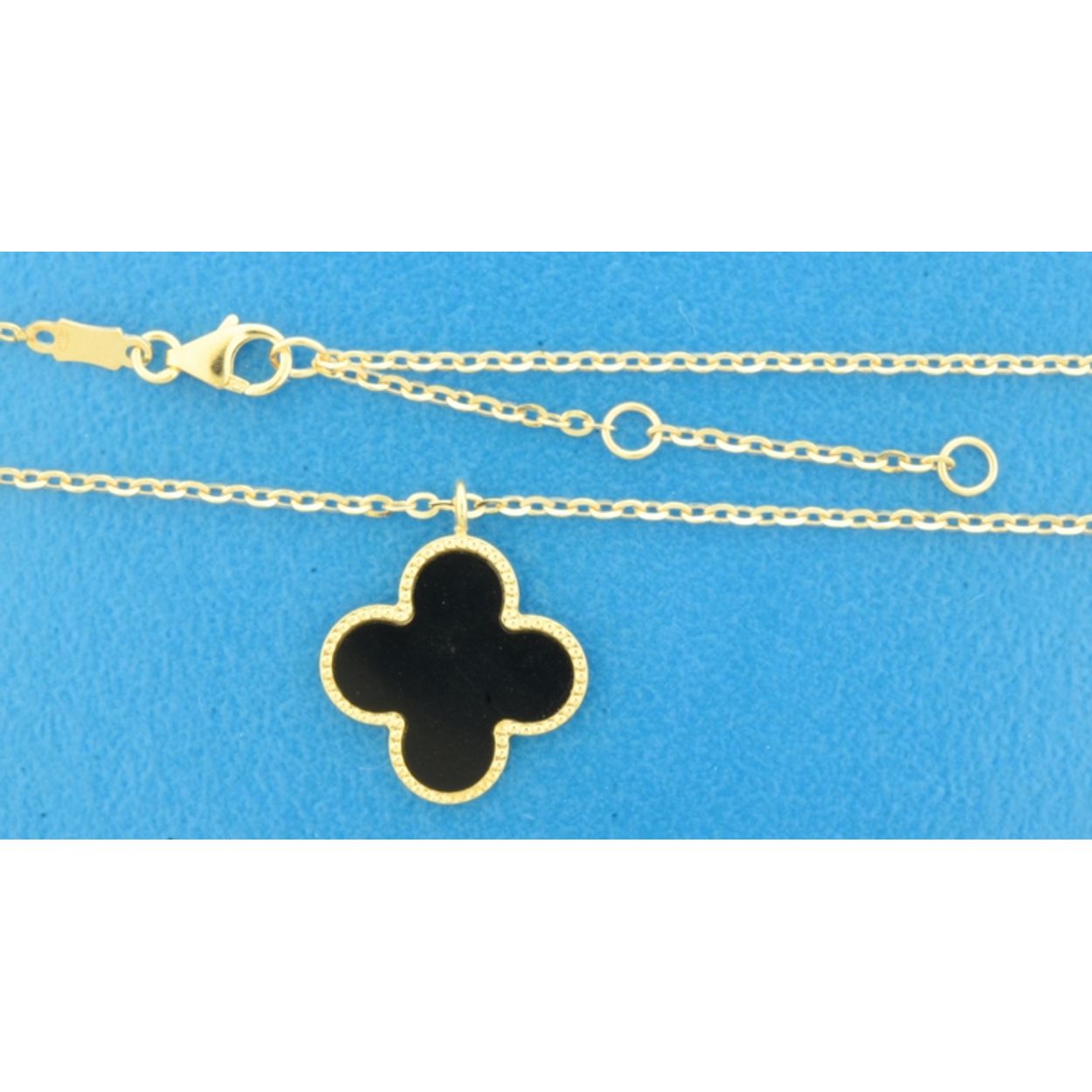 14k Geelgouden collier uitgevoerd met klavertje 4 hanger met onyx. De draaglengtes zijn 41, 43 en 45. De hanger heeft een afmeting van 18x15mm. De schakelbreedte is 1,5mm. Uitgevoerd met een karabijnsluiting.