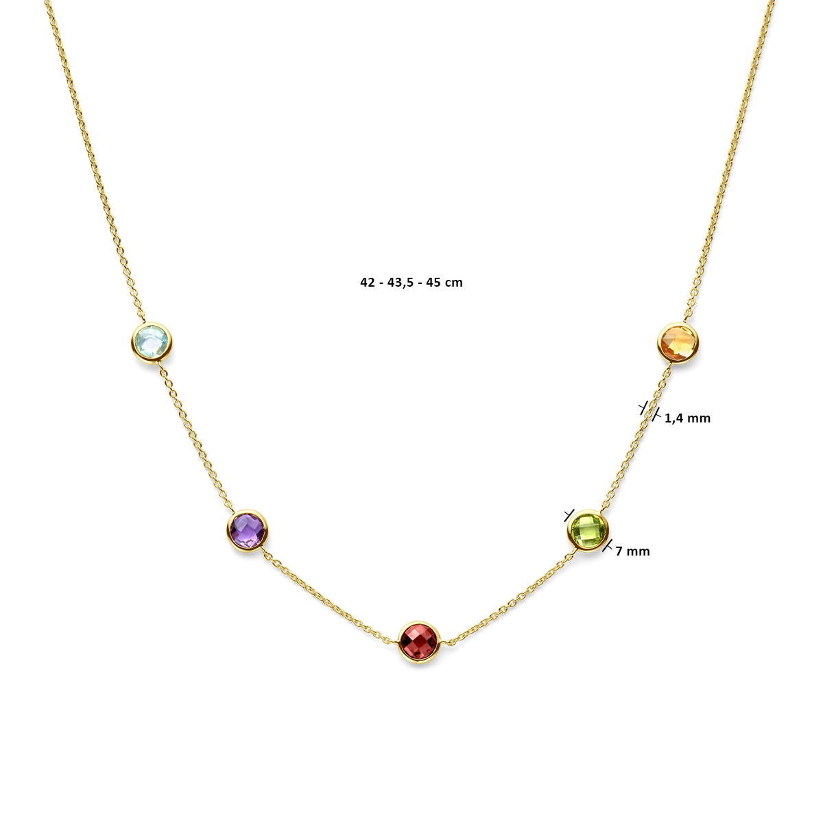 Geelgoud op 925 zilveren collier uitgevoerd met amethist, blauw topaas, granaat, peridot en citrien. Het collier heeft draaglengtes van 42-43.5-45cm. Uitgevoerd met karabijnsluiting. Geen garantie op de plating.