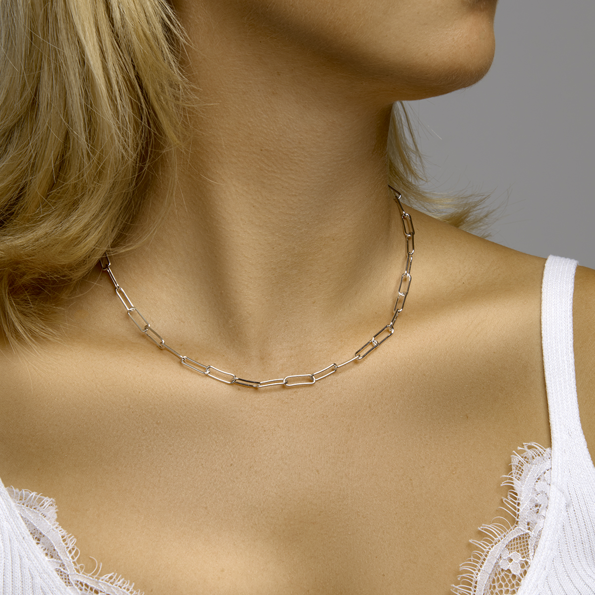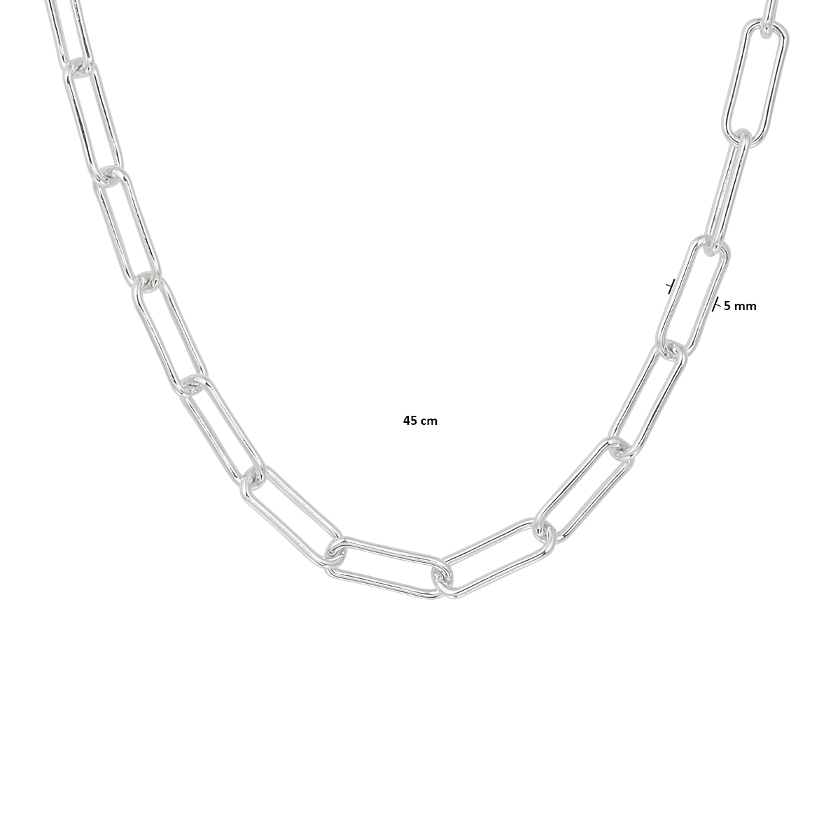 Gerhodineerd 925 zilveren paperclip collier met een schakelbreedte van 5mm. Het collier heeft een draaglengte van 45cm en een stevige karabijn sluiting.