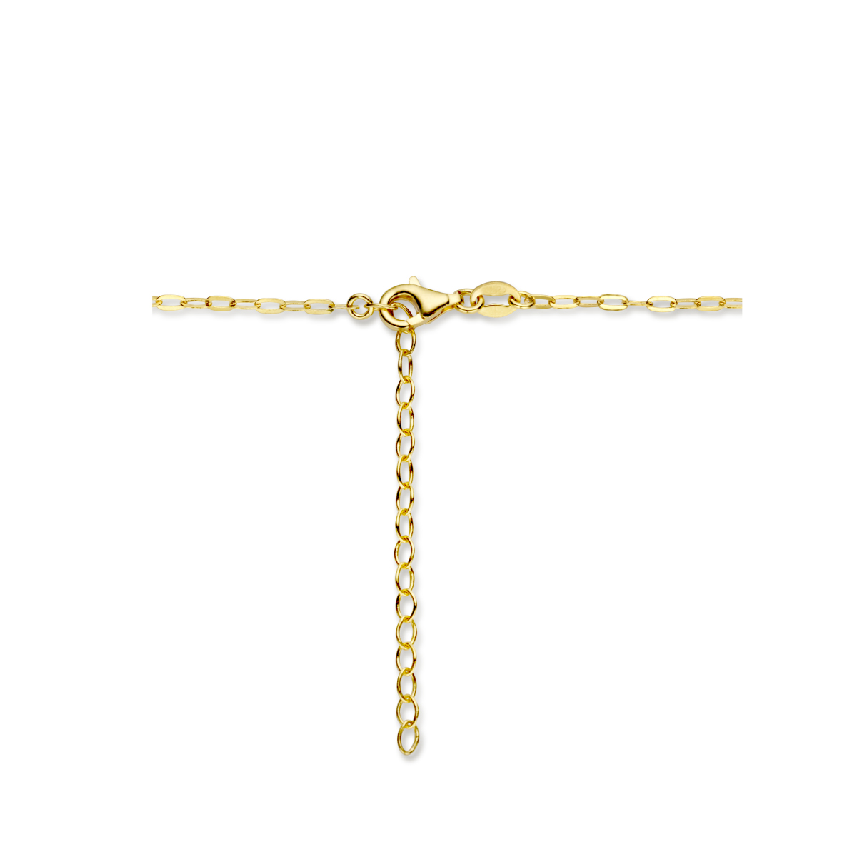 Goudkleurig 925 zilveren collier met synthetische parels. Het collier heeft een draaglengte van 40cm en een extensie van 5cm. De schakelbreedte is 1.8mm. Uitgevoerd met een karabijn sluiting. Geen garantie op plating.