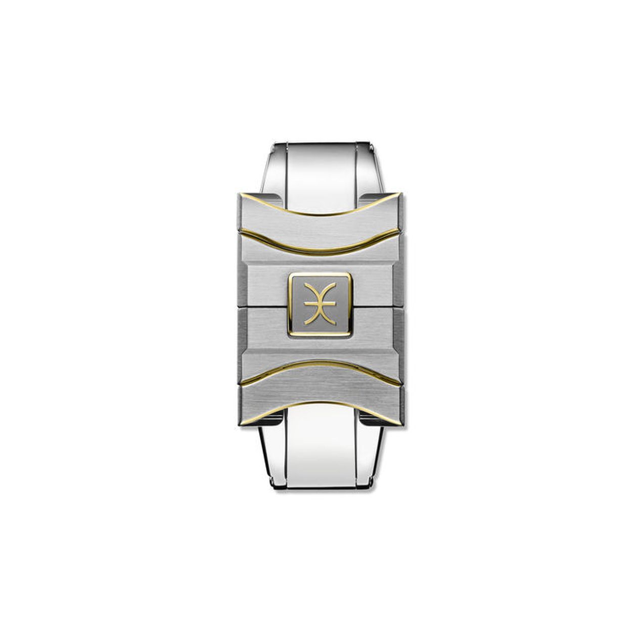 Aan de kast zit een roestvrij staal en 18K geelgouden schakelarmband met een verborgen vouwsluiting.