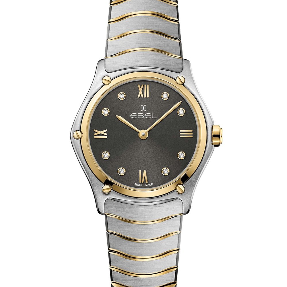 Het Classic Sport dameshorloge van Ebel is een klassiek model. Het horloge heeft een Zwitsers automatisch quartz uurwerk dat geplaatst is in 18K geelgouden kast van 29 mm. De wijzerplaat is sunburst grijs bezetmet diamant.