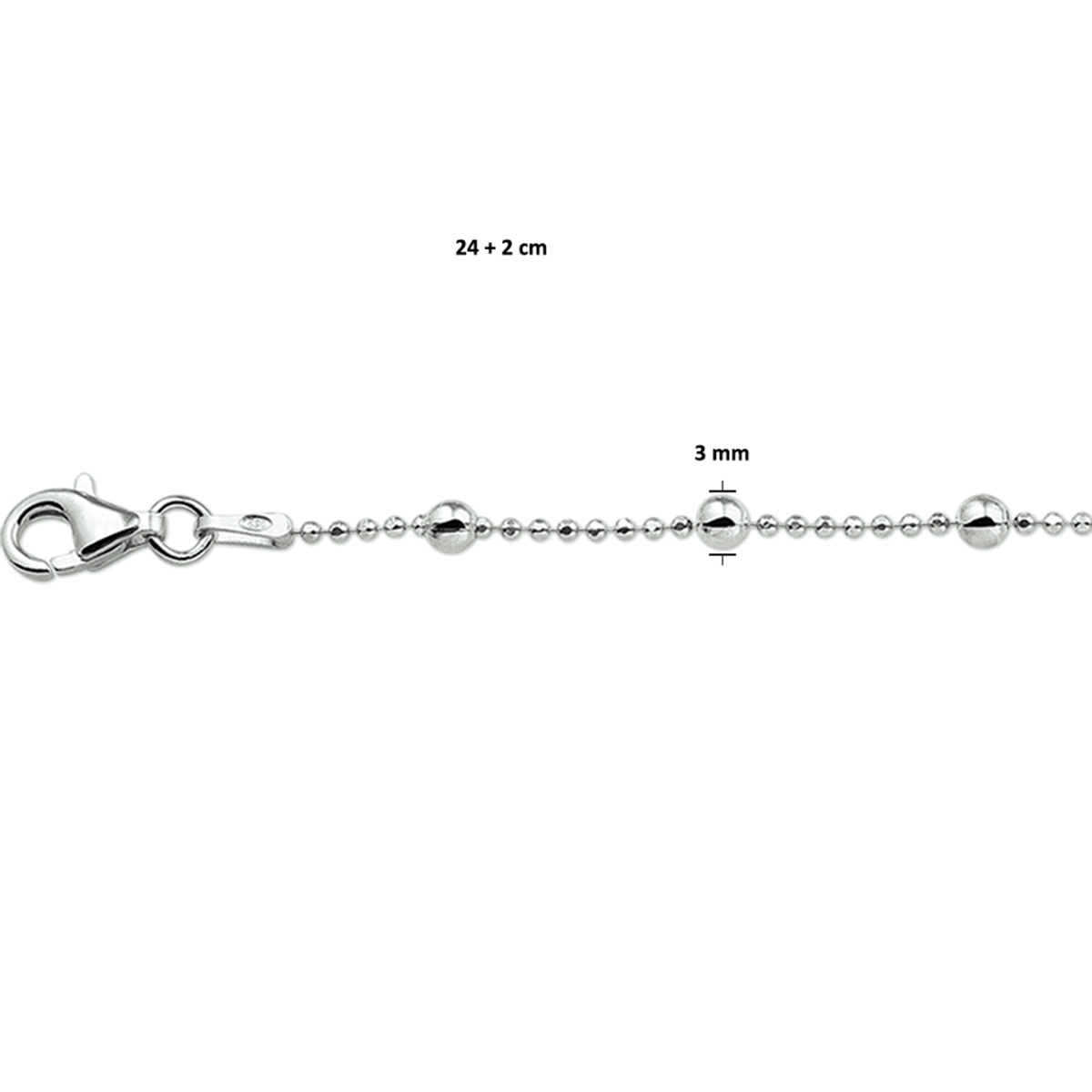 Trendy gerhodineerd zilveren bolletjes enkelbandje met een draaglengte van 24cm en een extensie van 2cm. Het enkelbandje is uitgevoerd met een stevige karabijn sluiting. Minimalistisch design voor een exclusieve uitstraling.