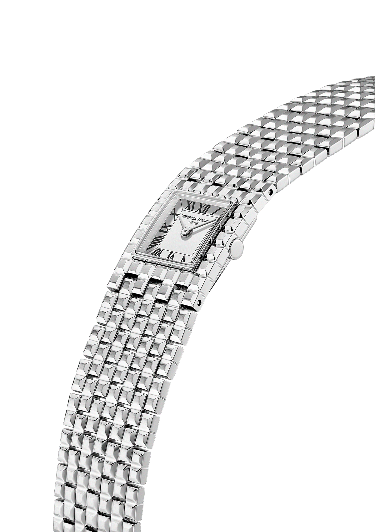 De manchette van de Genève-manufactuur, die al meer dan twintig jaar niet in de collectie zat, is terug met een sexy, glamrock-versie van wat ongetwijfeld een definitief manchethorloge moet zijn: een sierlijke armband met een reliëf van een vierkant clou de paris-patroon dat ook op de wijzerplaat wordt weerspiegeld, ook vierkant+