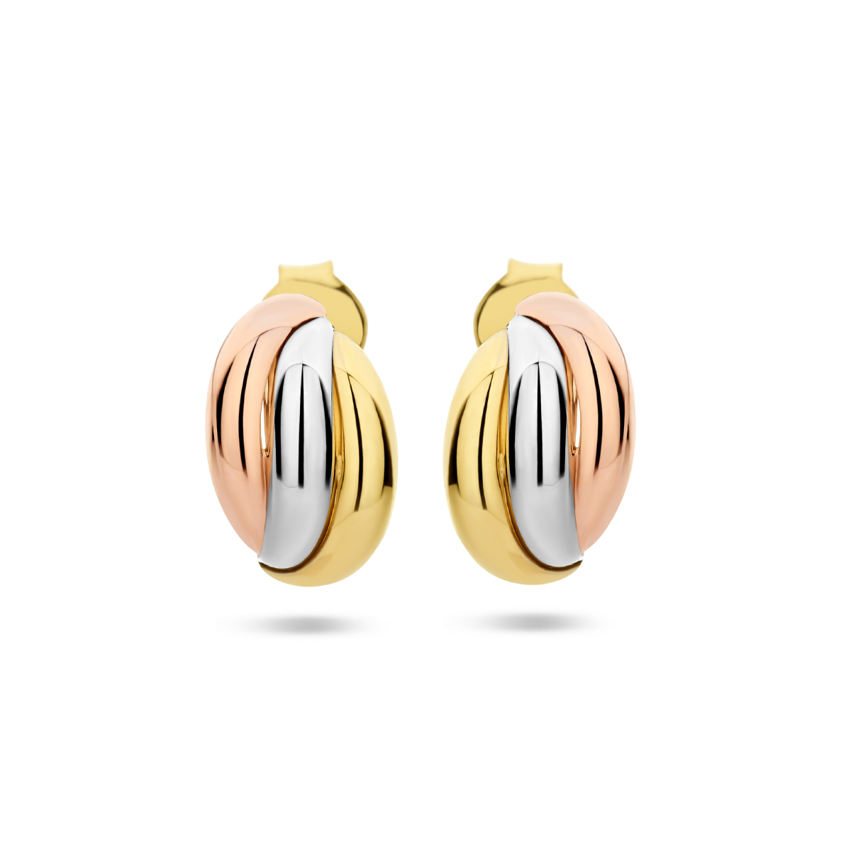 14k Tri-color wit-, rose- en geelgouden stekeroorringen met een diameter van 11.5mm.