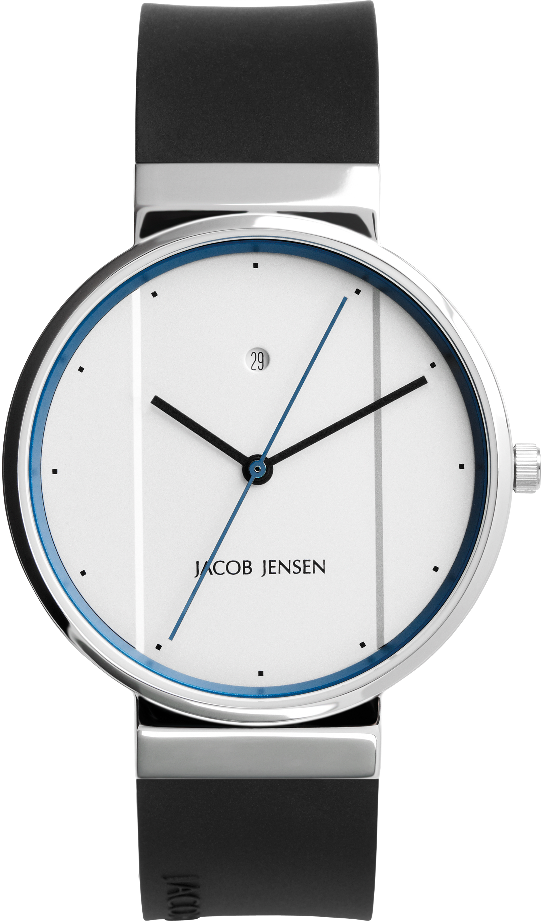 De Jacob Jensen New 770 is een horloge met over het midden van de wijzerplaat een verticale verdieping, als een optische verlenging van de horlogeband. De karakteristieke dubbele secondewijzer is blauw, net als de rand onder het minerale glas. De kast van het horloge is van glanzend roestvrij staal en aan het horloge zit een zwart rubberen horlogeband, die door de bijzondere bevestiging eenvoudig (zelf) uit te wisselen of te vervangen is.