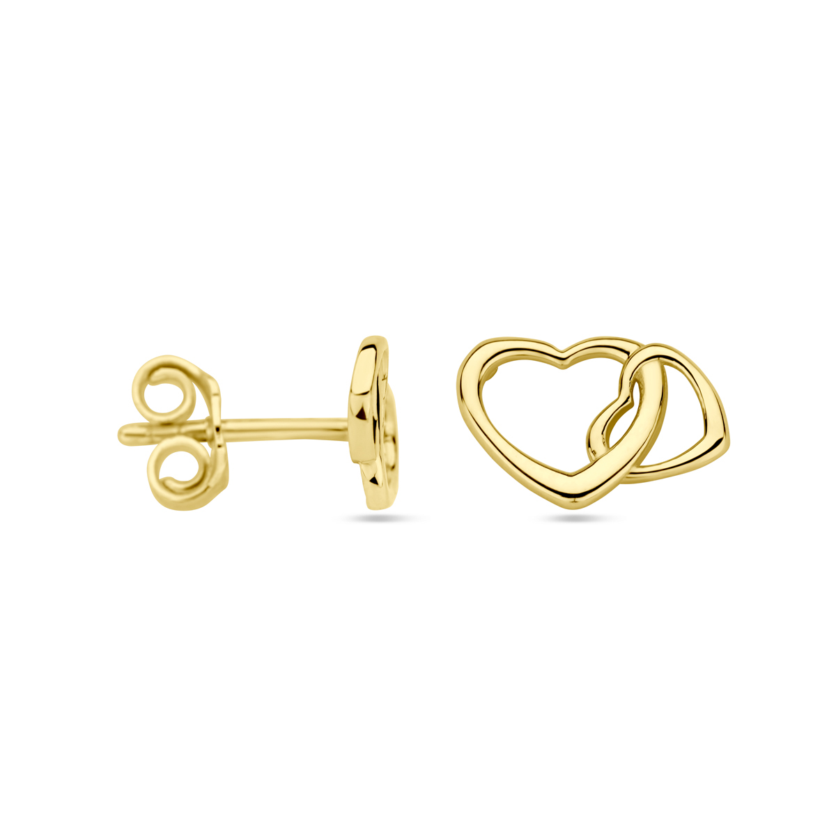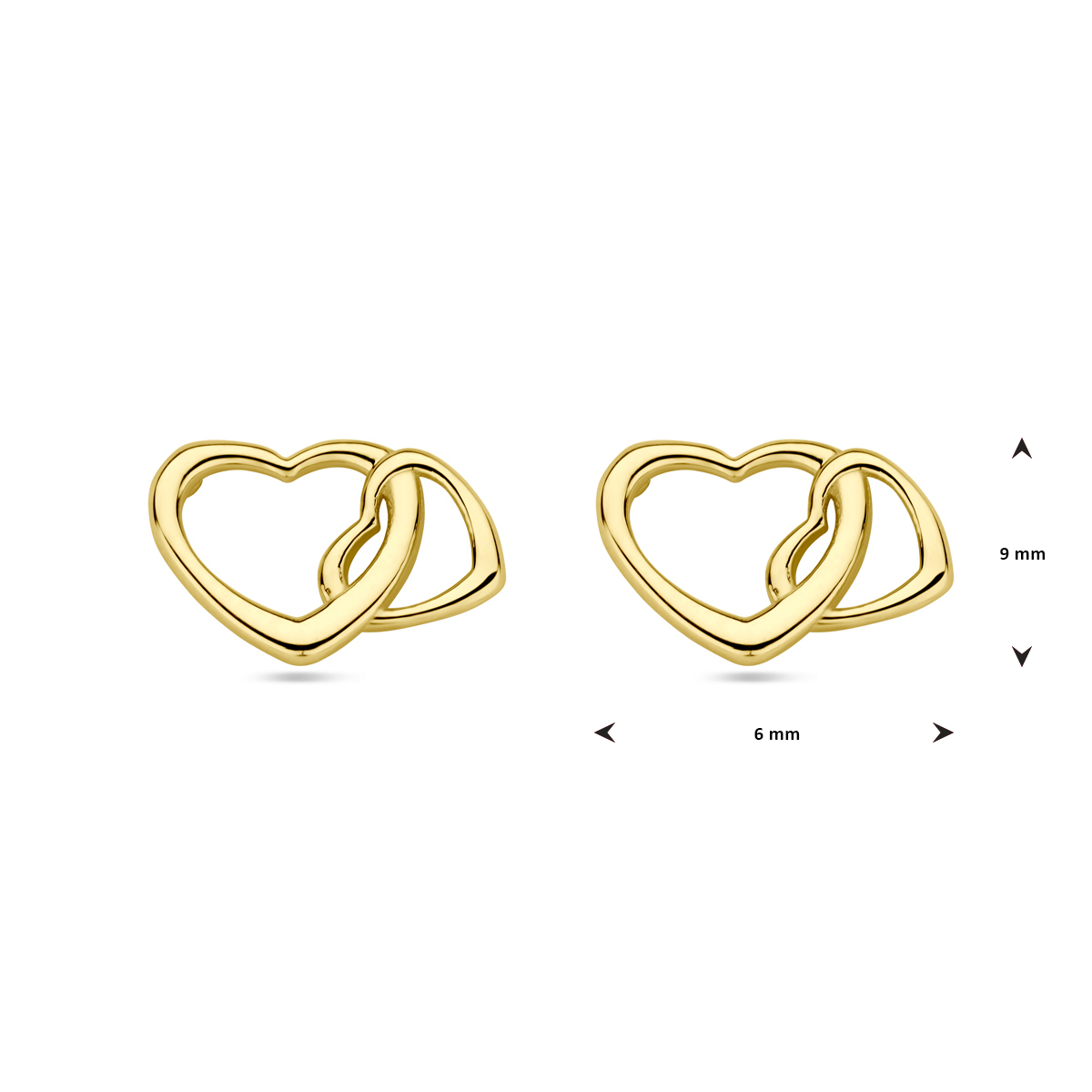 14k Geelgouden oorknoppen uitgevoerd met twee hartjes. De oorknoppen hebben een afmeting van 9x6mm.