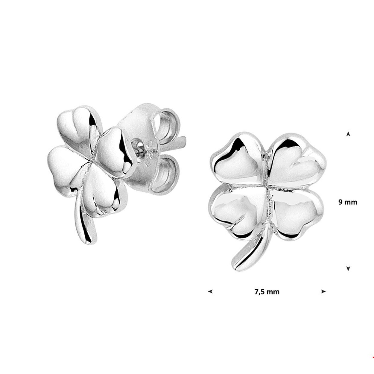 Beschrijving: Deze gerhodineerd zilveren klaver oorknoppen hebben een afmeting van 9x7.5mm. De klaverblaadjes hebben volgens de legende elk hun eigen voorstelling. Het eerste blad is hoop en het tweede blad is vertrouwen. Het derde blad is liefde en het vierde blad staat voor geluk. Door de zeldzaamheid en de vorm wordt het vinden of krijgen van een klavertje vier sinds de middeleeuwen beschouwd als een geluksbrenger. Tip: Leuk om kado te geven!