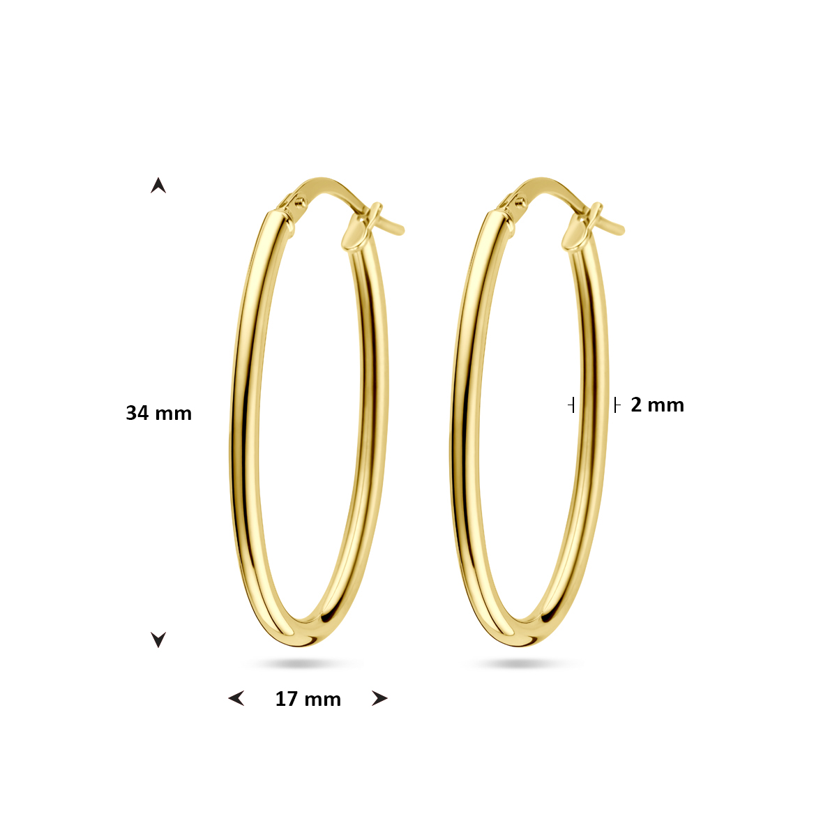 14k Geelgouden met een kern van 925 zilver. De oorringen hebben een afmeting van 34x2mm.