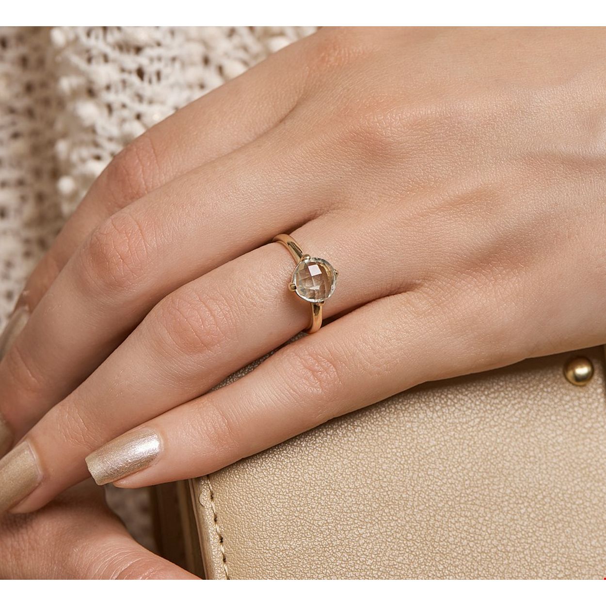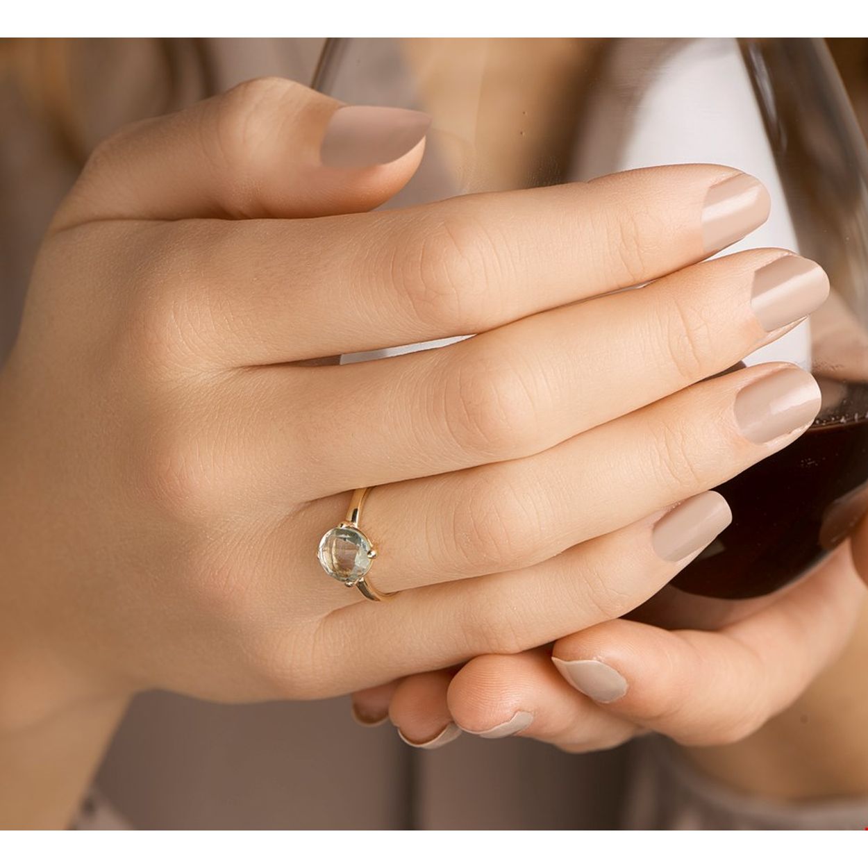Beschrijving: Stijlvolle 14k geelgouden ring uitgevoerd met een groen amethyst. De steen heeft een diameter van 8mm.