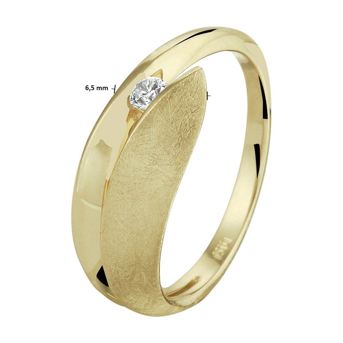 14k Geelgouden ring uitgevoerd met een schitterende diamant. De ring heeft een breedte van 6.5mm, maat 17,5. Mocht u een andere maat nodig hebben, neem dan gerust contact met ons op.