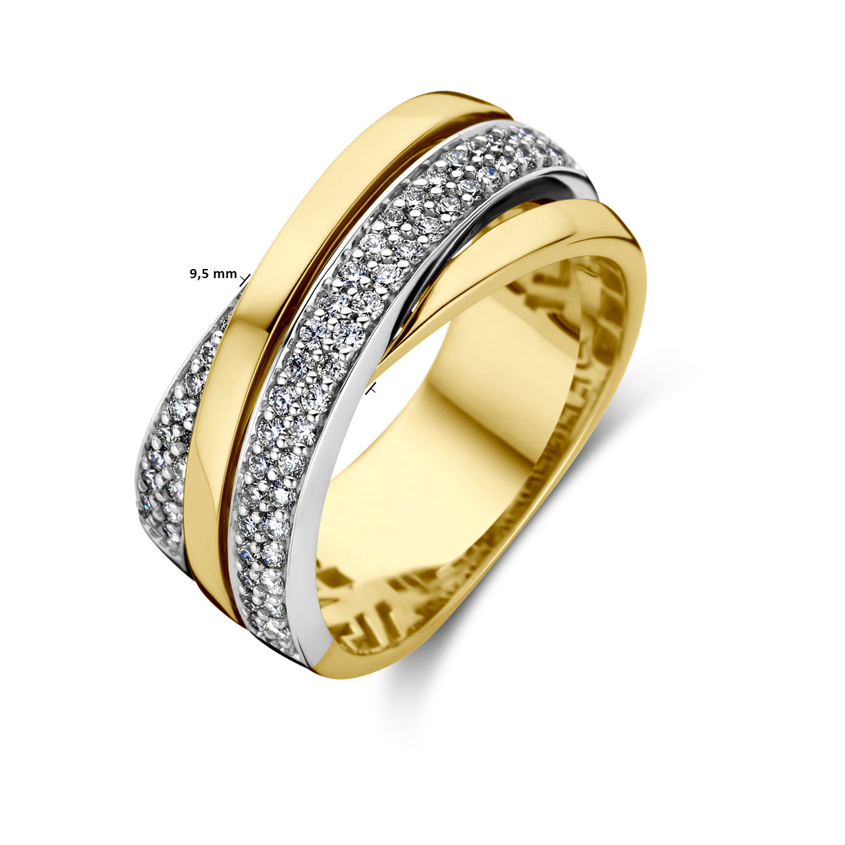 14k Bicolor geel- en witgouden ring uitgevoerd met diamanten. De ring heeft een breedte van 9.5mm.