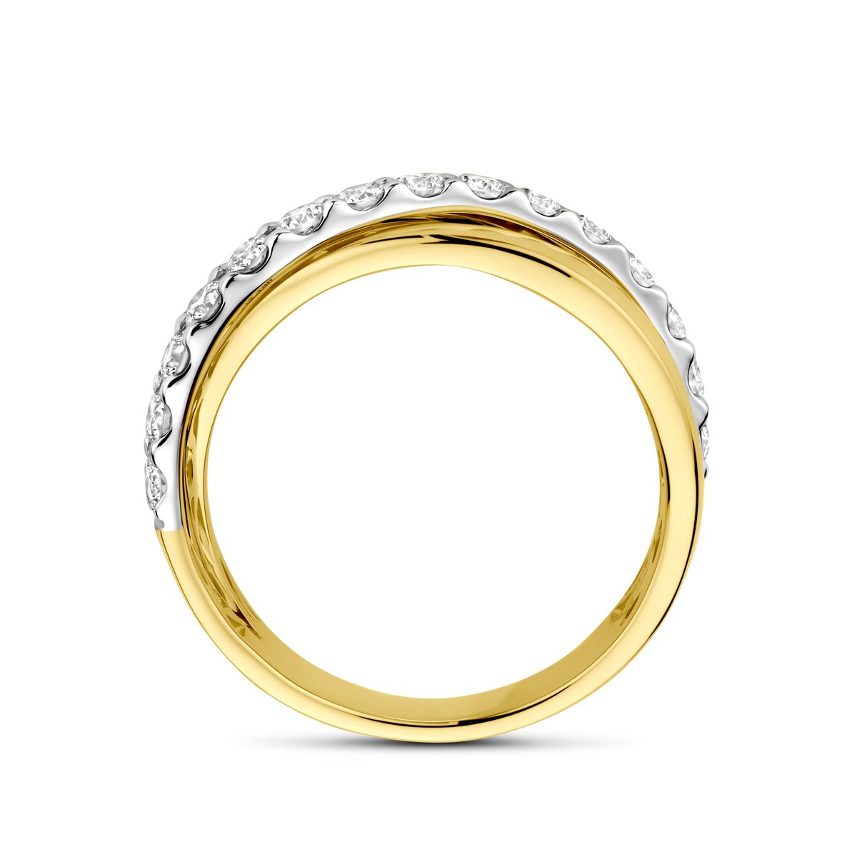14k Geel en witgouden ring uitgevoerd met diamant. De ring heeft een breedte van 7mm. Het totale diamantgewicht is 0.67ct.