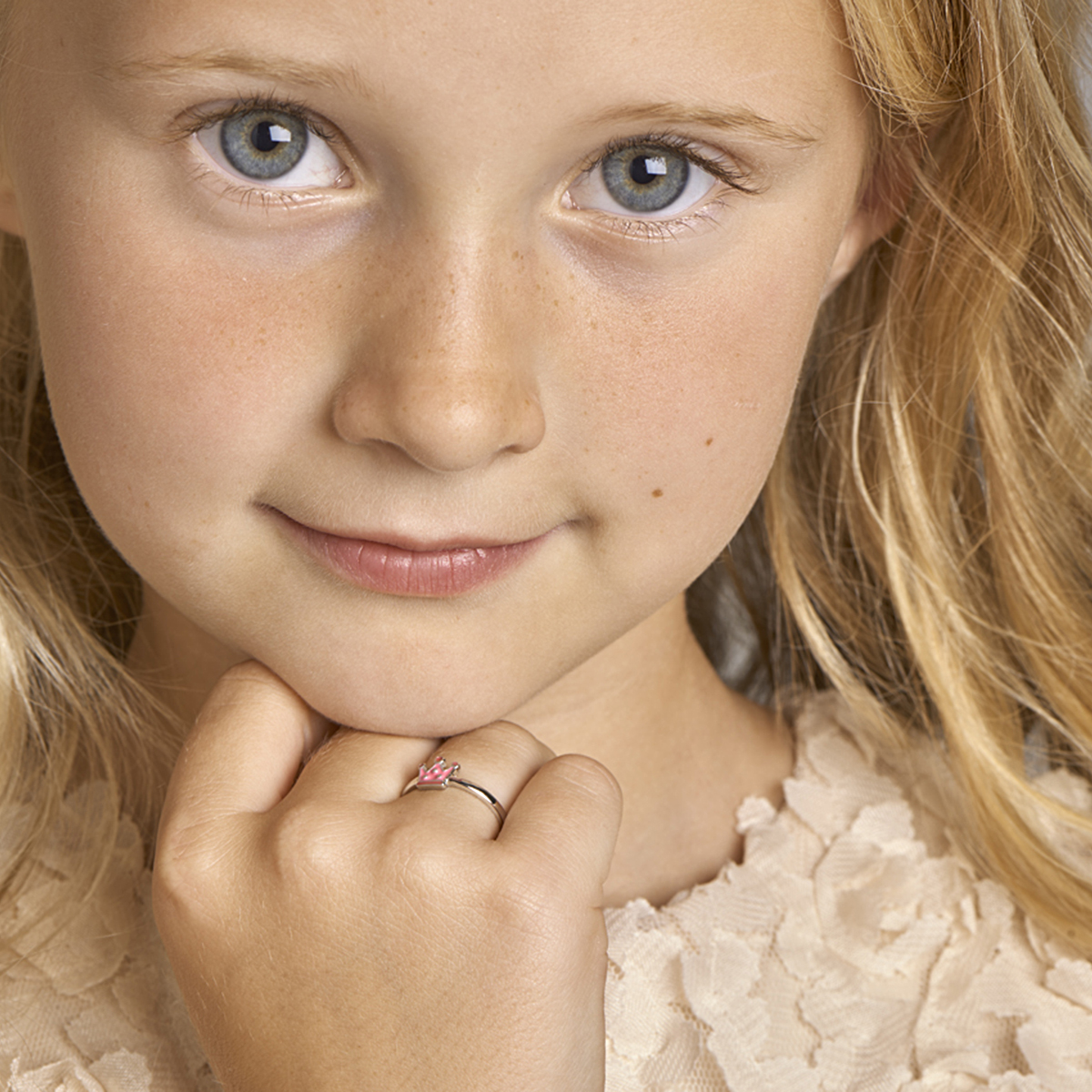 Gerhodineerd zilveren kroon kinderring uitgevoerd met rood en roze emaille. De ring is 5mm breed en verkrijgbaar in meerdere maten. Tip: Combineer deze ring met bijpassende sieraden uit onze collectie en maak zo een schitterende set!.