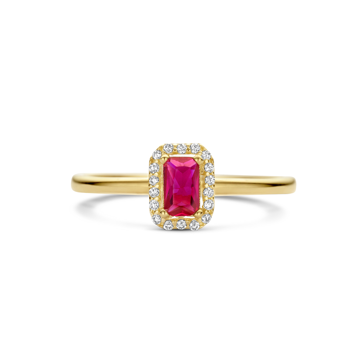 14k Geelgouden ring uitgevoerd met schitterende rode zirkonia. De ring heeft een breedte van 7.5mm.