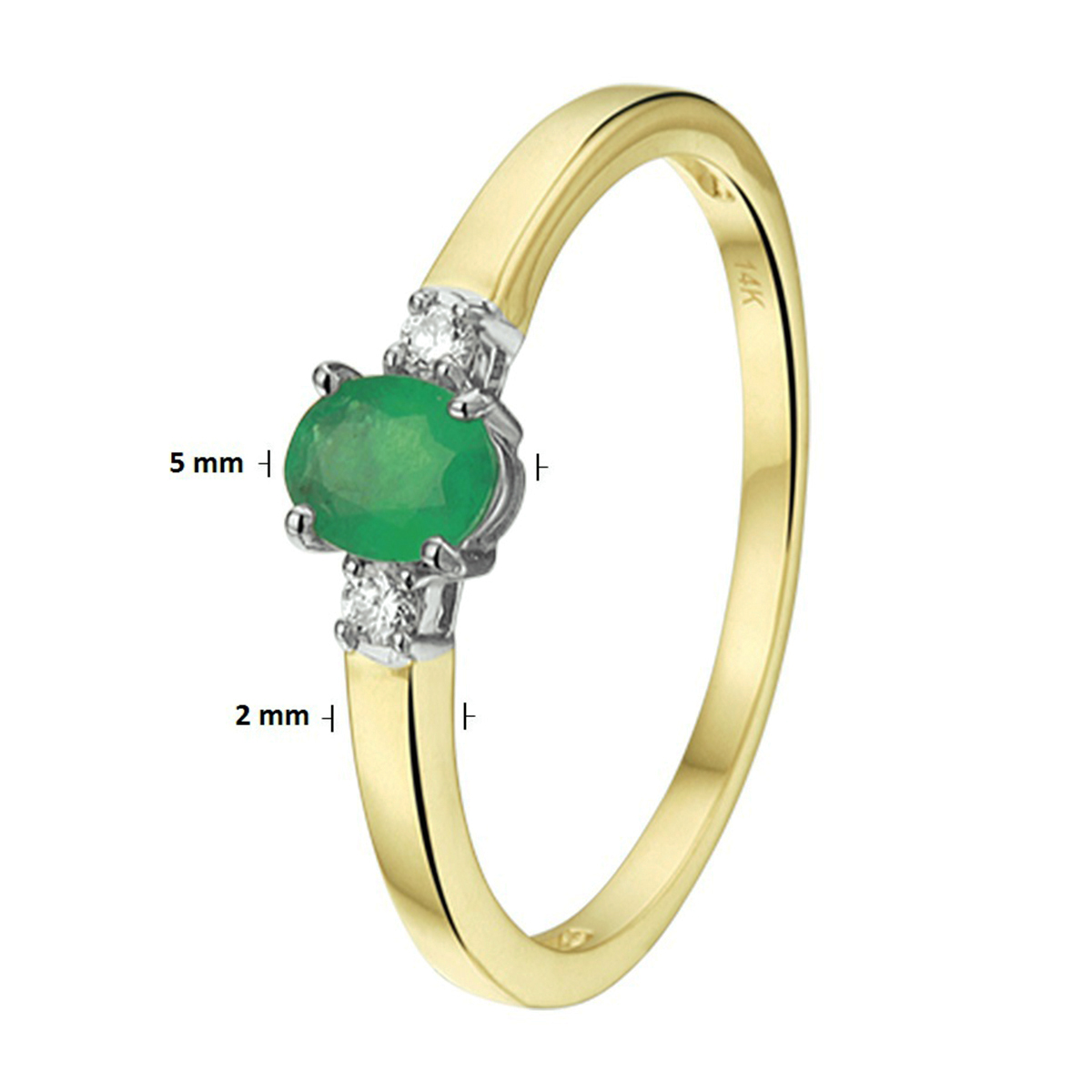 Bicolor geel en witgouden ring van 5mm breed uitgevoerd met een luxe solitaire smaragd steen en een rijzetting van diamant 0.05ct. Tip: Leuk om kado te doen aan dierbare of je geliefde. Diamonds are girls best friend!.