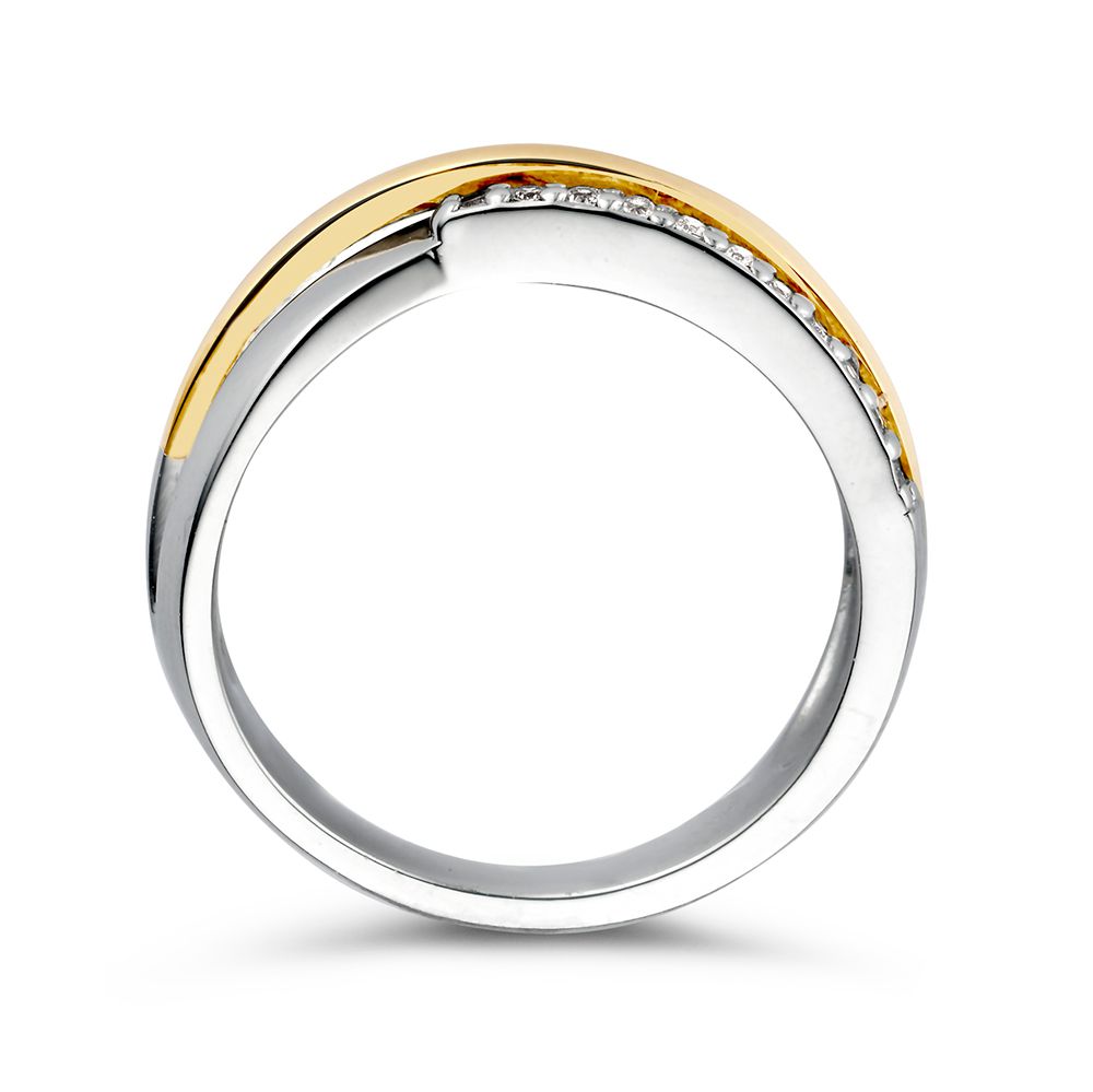 Gerhodineerde, zilveren damesring met 14 karaat goud (geen oplaag) en zirkonia's maat 58 en verkrijgbaar in diverse andere maten.