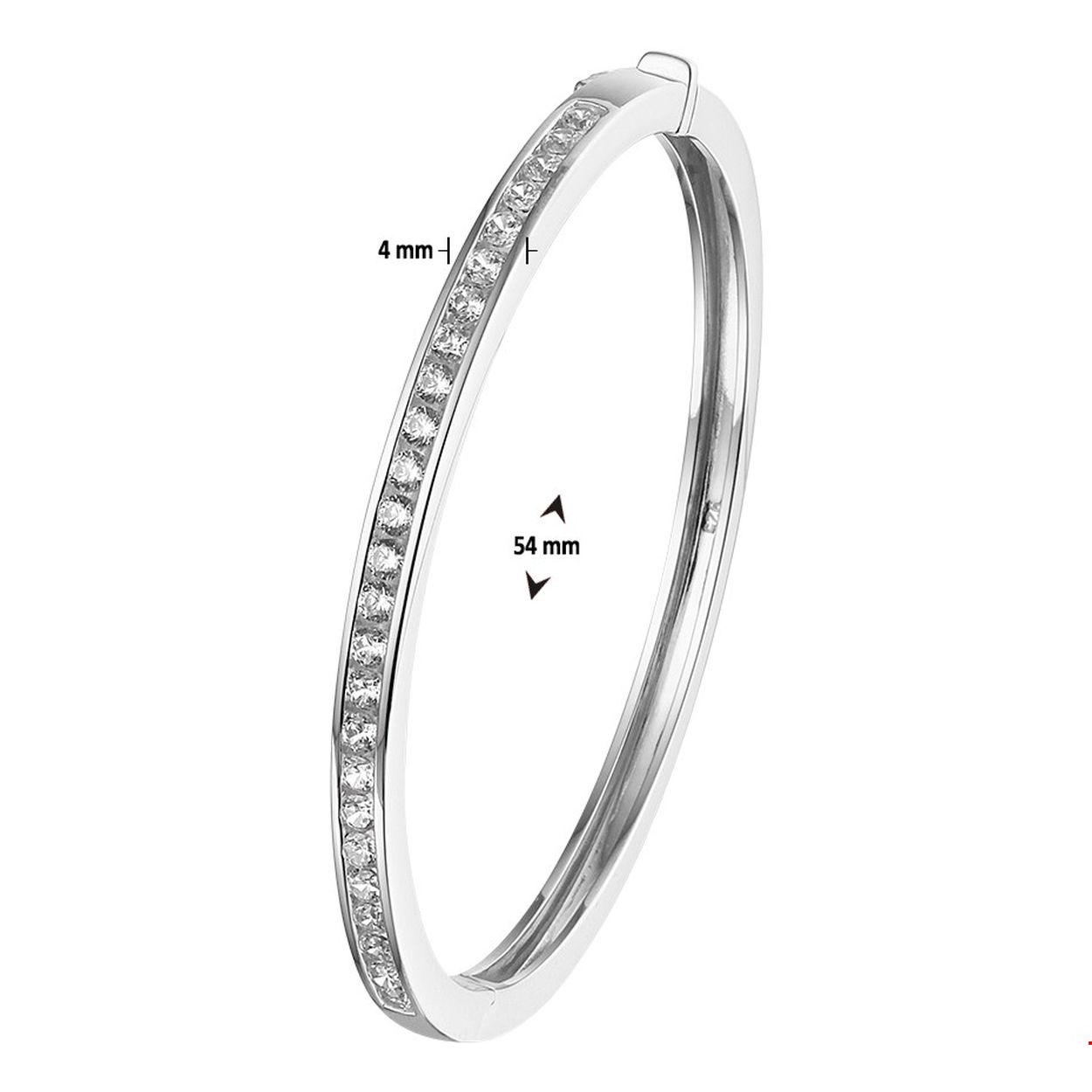Beschrijving: Gerhodineerd zilveren bangle uitgevoerd met een schitterende rij van zirkonia en een scharnier-sluiting. De bangle heeft een diameter van 54mm.