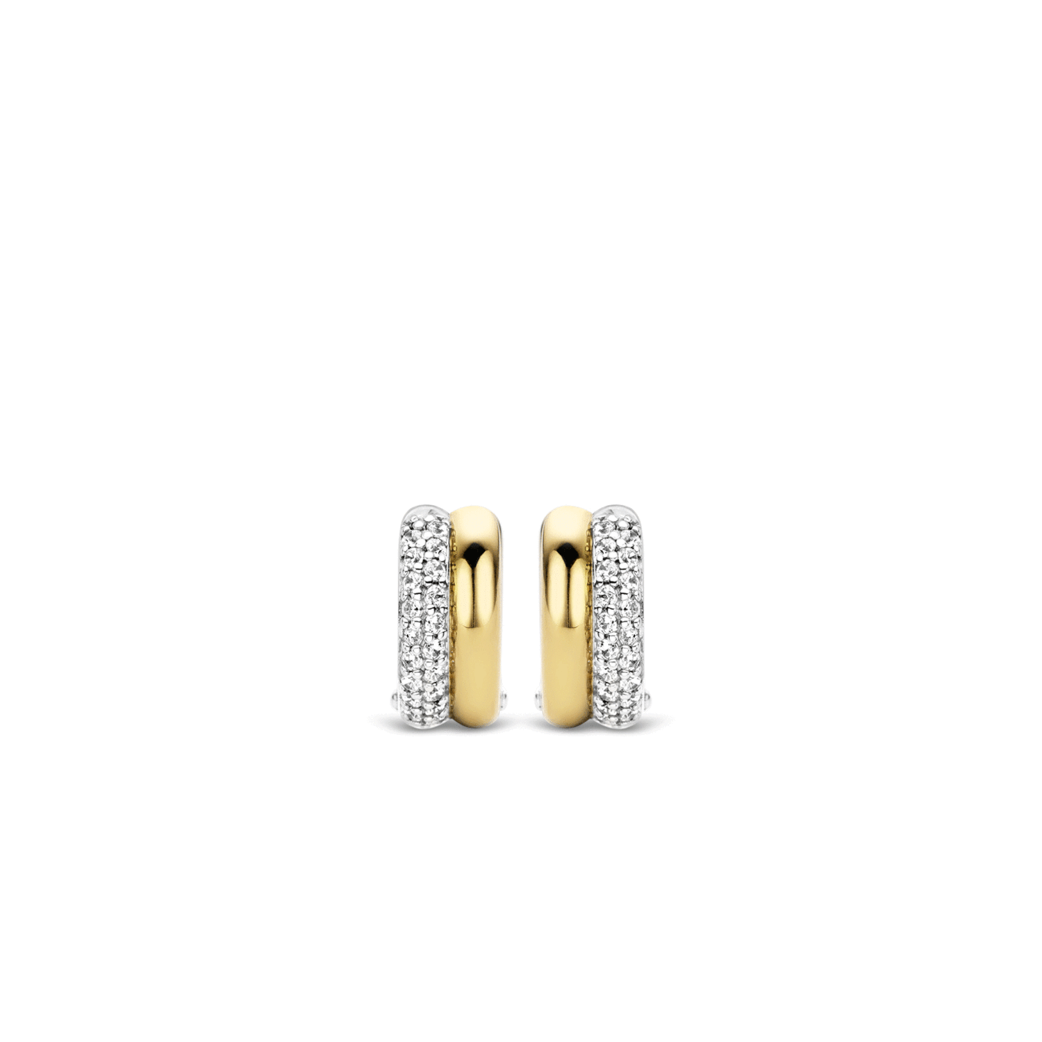 TI SENTO - Milano goudkleurig oorringen. Iedere oorbel heeft twee banden, waarbij een band goudkleurig is en de andere band gezet is met zirkonia's. De oorbellen zijn gemaakt van sterling zilver en zijn door de combinatie gemakkelijk te combineren.