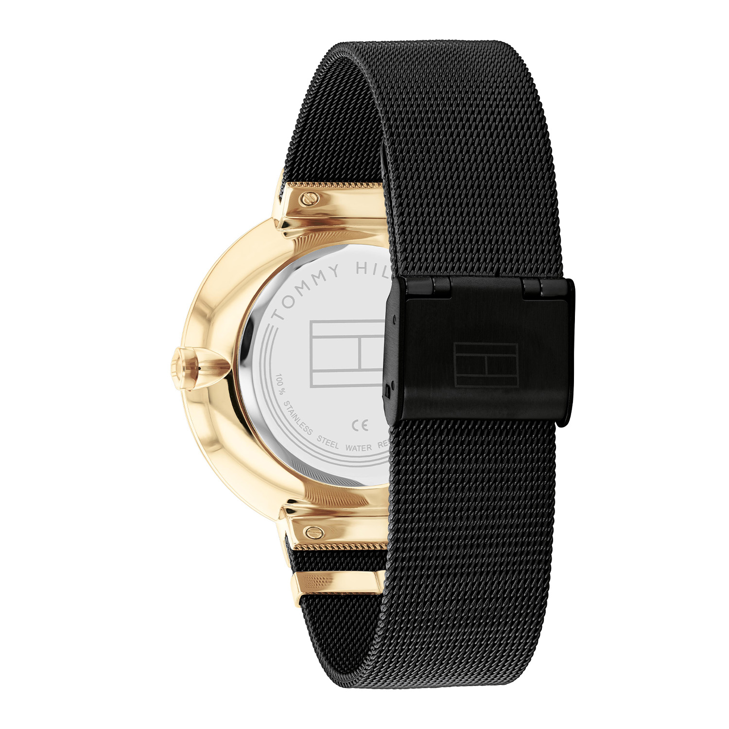 Dit prachtige Tommy Hilfiger horloge van de serie Lidia heeft een platte goud-kleurige kast en een zwarte wijzerplaat. De goud-kleurige details op de zwarte milanese band maken dit horloge helemaal af.